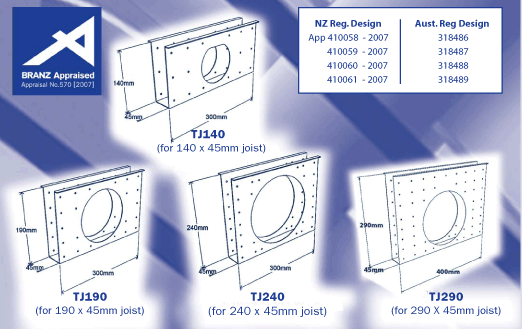 THRU-JOIST™ brackets enable holes to be cut up to 121mm diameter in flooring joists to allow services to run through the mid floor and other enclosed areas, without affecting the strength and stiffness requirements of a joist under NZS 3604:2011 and AS 1684.2-2011 (For Radiata Pine up to and including stress grades F8).